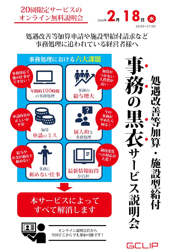 処遇改善等加算申請や施設型給付請求などの事務処理サポート! 2026.2.18開催|《無料開催》事務の黒衣サービス説明会