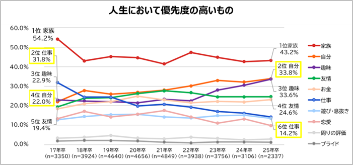 2017年卒は、家族>仕事>趣味>自分の順番だった優先度が、